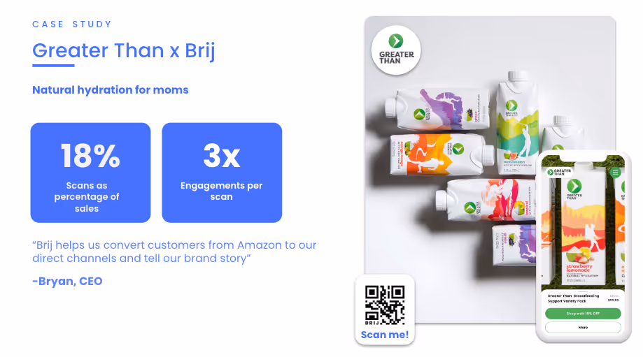 With another value-added touchpoint, brands are increasingly driving incremental growth in sales. Greater Than, a hydration brand for moms attributes 18% of sales to QR Codes.