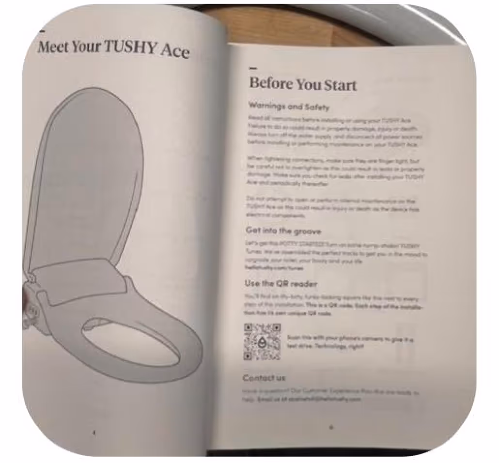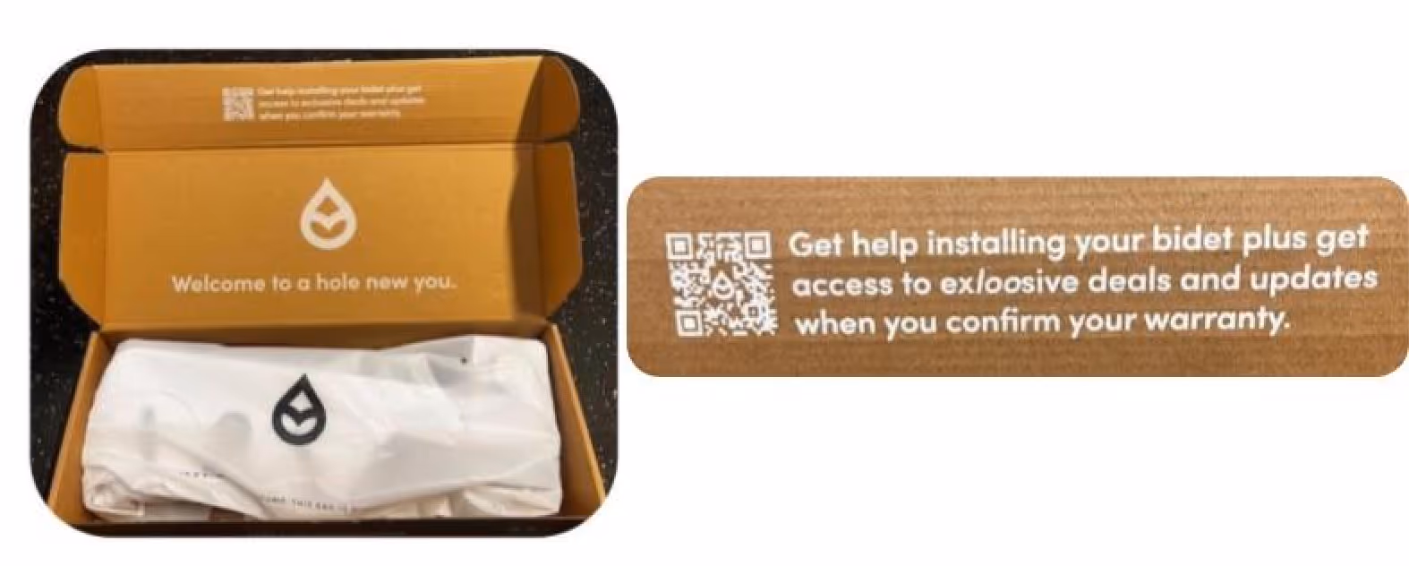 TUSHY's use of QR codes expanded beyond product manuals and promotions; they became a tool for fostering deeper connections with their audience. The integration with Brij allowed for real-time updates and personalized customer journeys, significantly boosting engagement metrics and strengthening brand loyalty. For example, the QR codes in the photos are used to collect 1st party data from customers purchasing in TUSHY's offline channels (i.e. Amazon, Walmart, etc). They also provide detailed set up guides, all in one experience.
